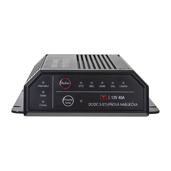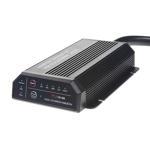 DC-DC 40 A Inteligentní nabíječka baterií je určena k nabíjení sekundární (pomocné) baterie během jízdy pomocí primární (startovací) baterie připojené k alternátoru nebo pomocí solárního panelu.