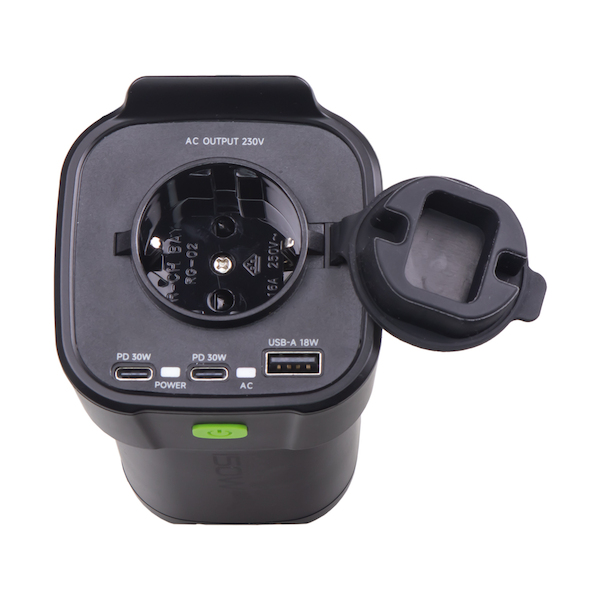Měnič je vybaven třemi USB konektory (1x USB, 2x USB-C) pro dobíjení nebo napájení USB zařízení + 1x AC výstupem 230 V / 150 W.