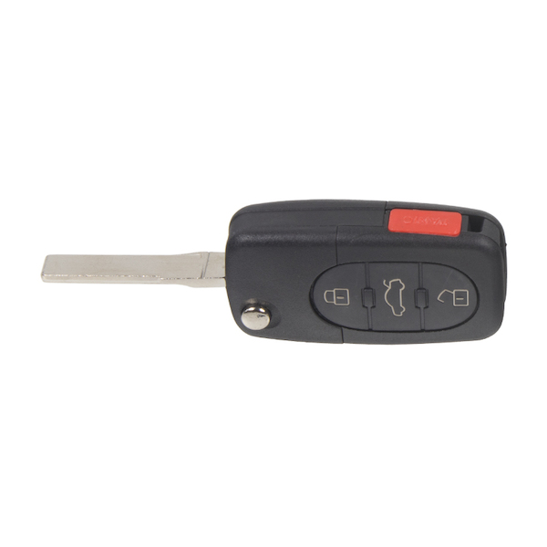 Náhradní vystřelovací autoklíč s dálkovým ovladačem pro vozy Audi. Součástí klíče je planžeta, dálkové ovládání centrálního zamykání se třemi tlačítky a čip ID 48 pro imobilizér. Náhrada originálního ovladače 4D0 837 231 K.