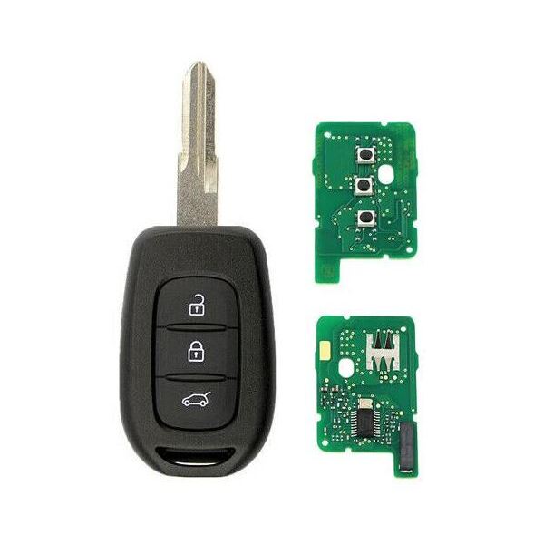 Náhradní klíč s dálkovým ovladačem pro vozy Dacia. Součástí klíče je planžeta klíče, dálkové ovládání centrálního zamykání se dvěmi tlačítky (čip PCF7961M).